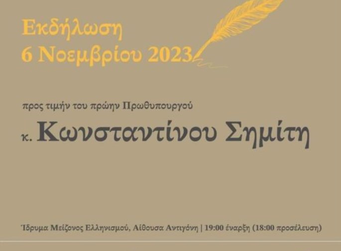 Ειδική ανοιχτή εκδήλωση προς τιμήν του πρώην Πρωθυπουργού Κώστα Σημίτη θα πραγματοποιηθεί  τη Δευτέρα 6 Νοεμβρίου στο “Κέντρο Πολιτισμού Ελληνικός Κόσμος”, στις 19:00 (ώρα άφιξης 18:00) από το ΔΙΚΤΥΟ για τη Μεταρρύθμιση στην Ελλάδα και την Ευρώπη, το Ινστιτούτο Ζακ Ντελόρ και το περιοδικό Μεταρρύθμιση με την υποστήριξη του Οικονομικού Φόρουμ των Δελφών
