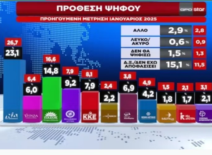 Τα υπόλοιπα κόμματα: ΚΚΕ 6,8%, ΣΥΡΙΖΑ 4,2%, Φωνή Λογικής 2,8%, Μέρα 25 2,1%, Νέα Αριστερά 2%, Νίκη 1,9%, Κίνημα Δημοκρατίας 1,8%. Η δεξαμενή των αναποφάσιστων αυξάνεται σημαντικά, φτάνοντας το 17,9% από 13,3% τον περασμένο Νοέμβριο, υπογραμμίζοντας την αστάθεια στην εκλογική συμπεριφορά των πολιτών.