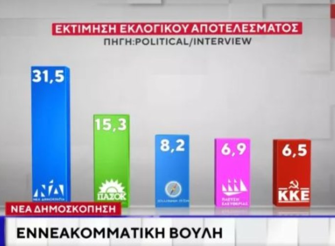 ΗΝέα Δημοκρατία καταγράφει ποσοστό 31,5% στην εκτίμηση ψήφου, διατηρώντας προβάδισμα 16,2 μονάδων έναντι του ΠΑΣΟΚ, σύμφωνα με δημοσκόπηση της Interview που πραγματοποιήθηκε για λογαριασμό της εφημερίδας Political και παρουσιάστηκε στον Ant1.
