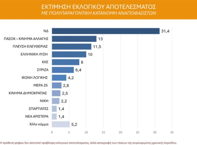 Χαμηλότερα στην εκτίμηση ψήφου καταγράφονται το ΚΚΕ με 8%, ο ΣΥΡΙΖΑ με 6,4%, η Φωνή Λογικής με 4,2%, το ΜέΡΑ25 με 2,8%, το Κίνημα Δημοκρατίας με 2,5%, η Νίκη με 2,2%, οι Σπαρτιάτες με 1,4% και η Νέα Αριστερά επίσης με 1,4%. Η εικόνα αυτή αναδεικνύει ένα εξαιρετικά πολυκερματισμένο πολιτικό τοπίο, με πολλαπλές μικρές δυνάμεις να διεκδικούν τμήματα της δυσαρέσκειας, ιδίως στα αριστερά της ΝΔ.