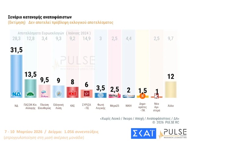 Στους αναποφάσιστους η Νέα Δημοκρατία κερδίζει με 31,5%, με το ΠΑΣΟΚ να είναι δεύτερο με 13,5%.