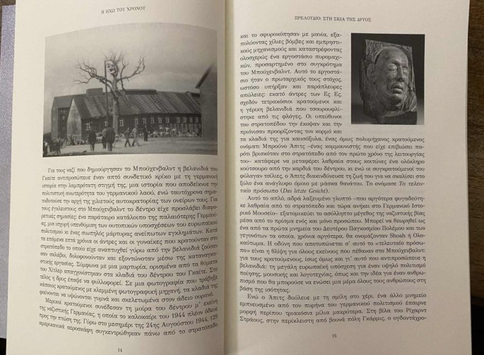 (Στις φωτό: Δύο από τις σελίδες του βιβλίου όπου περιγράφεται η συγκλονιστική ιστορία της -υποτιθέμενης- «βελανιδιάς του Γκαίτε», που βρισκόταν μέσα στον περίβολο του στρατοπέδου του Μπούχενβαλντ, αριστερά, φωτογραφημένης παράνομα, από έναν έγκλειστο όσο οι Ναζί την διατηρούσαν ως απόδειξη της «ανωτερότητας και της συνέχειας της γερμανικής φυλής» (όπου από τα κλαδιά της κρέμασαν και μερικούς καταδικασμένους) πριν καταλήξει να καεί από τους βομβαρδισμούς των Συμμάχων και να κοπεί για να μετατραπεί σε καυσόξυλα -και, δεξιά, ένα κούτσουρο της βελανιδιάς που ένας πολυμήχανος κρατούμενος ονόματι Bruno Apitz –ένας κομμουνιστής που είχε επιβιώσει παρότι βρισκόταν στο στρατόπεδο από τον πρώτο χρόνο της λειτουργίας του– κατάφερε να μεταφέρει λαθραία στους κοιτώνες από την καρδιά του δέντρου, κι ενώ οι συγκρατούμενοί του φύλαγαν τσίλιες, ο Άπιτζ διακινδύνευσε τη ζωή του για να σκαλίσει στο ξύλο ένα ανάγλυφο, όμοιο με μάσκα θανάτου, ονομάζοντας το Das letzte Gesicht -"Το τελευταίο πρόσωπο". Μαζί με το εξώφυλλο και το οπισθόφυλλο του βιβλίου).