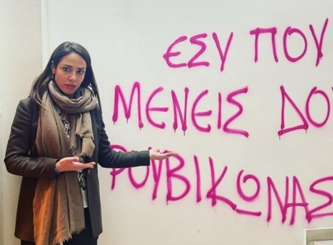 Όπως έκανε γνωστό η ίδια η υφυπουργός Εργασίας και Κοινωνικών Υποθέσεων, αρμόδια για θέματα Πρόνοιας και Κοινωνικής Αλληλεγγύης, έγραψαν συνθήματα στην είσoδο του κτιρίου.