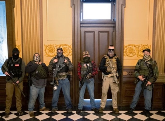 Έξω από το Καπιτώλιο, διαδηλωτές κράταγαν ένα πλακάτ στο οποίο αναγραφόταν σύνθημα εναντίον του περιορισμού με φωτομοντάζ που μετατρέπει τη δημοκρατική κυβερνήτρια της πολιτείας Γκρέτσεν Γουίτμερ στον Αδόλφο Χίτλερ.