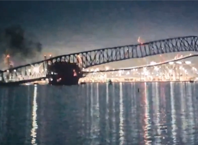 Η υπηρεσία Μεταφορών του Μέριλαντ επεσήμανε ότι ένα φορτηγό πλοίο έπεσε πάνω σε έναν από τους πυλώνες της γέφυρας.