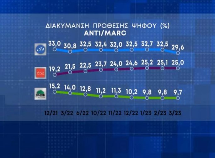 Σημαντική μείωση της διαφοράς ανάμεσα σε Νέα Δημοκρατία και ΣΥΡΙΖΑ καταγράφει η δημοσκόπηση της Marc, η πρώτη μετά την τραγωδία των Τεμπών, που διενεργήθηκε για λογαριασμό του ΑΝΤ1.