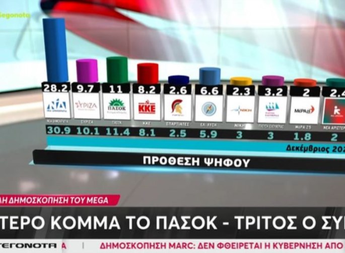 Στην πρόθεση ψήφου η Νέα Δημοκρατία καταγράφει 28,2%. Ακολουθεί το ΠΑΣΟΚ με 11%, ο ΣΥΡΙΖΑ με 9,7% και το ΚΚΕ με 8,2%. Μεγάλη αύξηση καταγράφει η Ελληνική Λύση που φτάνει στο 6,6% και ακολουθεί η Πλεύση Ελευθερίας με 3,2%. Κάτω από το όριο εκπροσώπησης στη Βουλή, οι Σπαρτιάτες με 2,6%, η Νίκη με 2,3%, η Νέα Αριστερά με 2,4% και το ΜέΡΑ25 με 2%.