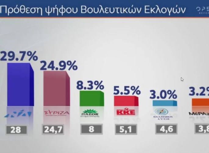 Στην πρόθεση ψήφου, η ΝΔ συγκεντρώνει 29,7%, έναντι 24,9% του ΣΥΡΙΖΑ.
