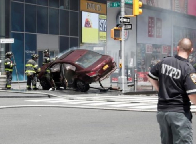 Οι μάρτυρες είπαν ότι ο οδηγός έριξε το κόκκινο Honda πάνω στο πεζοδρόμιο, χτυπώντας πεζούς. Το αυτοκίνητο προσέκρουσε σε κολώνα και σταμάτησε στη γωνία 45ης Οδού και Μπροντγουέι πριν η αστυνομία απομακρύνει τον οδηγό.