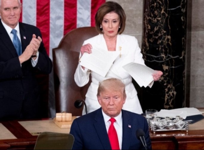 Η πρόεδρος της Βουλής των Αντιπροσώπων, η Δημοκρατική Νάνσι Πελόσι, εκδήλωσε με θεαματικό τρόπο τη διαφωνία της με τον Ρεπουμπλικάνο πρόεδρο Ντόναλντ Τραμπ, καθώς ολοκλήρωνε τον λόγο του για την Κατάσταση της Ένωσης στο Κογκρέσο, κάνοντας δύο κομμάτια το αντίτυπο του κειμένου της ομιλίας που της είχε δώσει νωρίτερα ο ένοικος του Λευκού Οίκου. Καθώς ο αμερικανός πρόεδρος ολοκλήρωνε τον λόγο του, η Πελόσι, η οποία βρισκόταν, όπως το θέλει η αμερικανική κοινοβουλευτική παράδοση, καθισμένη πίσω του, πλάι στον αντιπρόεδρο Μάικ Πενς, σηκώθηκε, πήρε επιδεικτικά το έγγραφο που βρισκόταν μπροστά της στα χέρια της και το έσκισε. Εξερχόμενη από την αίθουσα, ερωτηθείσα από δημοσιογράφο για ποιον λόγο προχώρησε σε αυτή τη χειρονομία, η πρόεδρος της Βουλής των Αντιπροσώπων έδωσε τη σιβυλλική απάντηση: «Διότι αυτό ήταν το πιο ευγενικό πράγμα που μπορούσα να κάνω, σε σύγκριση με τις εναλλακτικές».