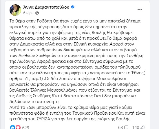 Παρέμβαση στην υπόθεση των δύο μουσουλμάνων που εξελέγησαν με τα ψηφοδέλτια του ΣΥΡΙΖΑ σε Ροδόπη και Ξάνθη έκανε η Άννα Διαμαντοπούλου με ανάρτησή της στο Facebook.