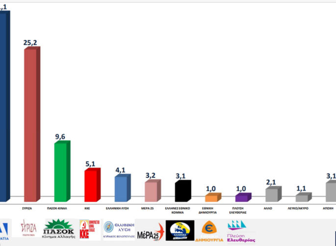 Πιο συγκεκριμένα, τα κόμματα εμφανίζονται με τις εξής δημοσκοπικές επιδόσεις: ΝΔ 31.1%, ΣΥΡΙΖΑ 25.2%, ΠΑΣΟΚ 9.6%, Κ.Κ.Ε 5.1%, ΕΛΛΗΝΙΚΗ ΛΥΣΗ 4.1%, ΜΕΡΑ 25 3.2% , ΕΛΛΗΝΕΣ 3.1%, ΕΘΝΙΚΗ ΔΗΜΙΟΥΡΓΙΑ 1%, ΠΛΕΥΣΗ ΕΛΕΥΘΕΡΙΑΣ 1%, ΑΛΛΟ 2.1%, ΛΕΥΚΟ/ΑΚΥΡΟ 1.1%, ΑΠΟΧΗ 3.1% και ως αναποφάσιστοι εμφανίζεται το 10.3%.