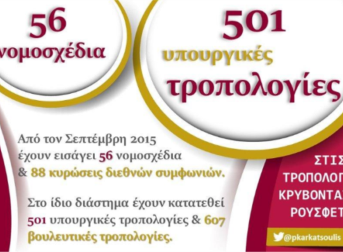 « Όμως την τελευταία διετία έχει ξεπεραστεί κάθε προηγούμενο. Από τις εκλογές του Σεπτεμβρίου του 2015 μέχρι σήμερα η κυβέρνηση έχει φέρει στη Βουλή 56 νομοσχέδια και 88 κυρώσεις διεθνών συμφωνιών. Ενώ, λοιπόν, η κυβέρνηση υπήρξε φειδωλή σε ό,τι αφορά την νομοθετική της πρωτοβουλία δια της ευθείας οδού, η οποία περιλαμβάνει διαβούλευση και διεξοδική συζήτηση στη Βουλή, δεν τσιγκουνεύτηκε καθόλου στην νομοθέτηση δια της πλαγίας οδού των τροπολογιών: 501 φορές θυμήθηκαν οι υπουργοί των ΣΥΡΙΖΑΝΕΛ ότι κάτι έχουν ξεχάσει, μια σούπερ επείγουσα διάταξη που έπρεπε να περάσει την τελευταία στιγμή, γιατί αλλιώς θα καταστρέφονταν το σύμπαν. Το ξαναλέμε για να γίνει σαφές το μέγεθος της κοροϊδίας: οι υπουργοί των ΣΥΡΙΖΑ-ΑΝΕΛ συνέταξαν μόνο 56 νομοσχέδια ενώ κατέθεσαν 501 τροπολογίες.
