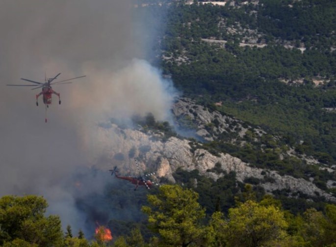 Μέχρι να πέσει το σκοτάδι, ελικόπτερα ενεργούσαν συνεχώς στο μέτωπο της πυρκαγιάς, ενώ στην ουρά της φωτιάς, επτά πυροσβεστικά αεροσκάφη Air Tractors έκαναν το ένα μετά το άλλο ρίψεις επιβραδυντικού υγρού από την πλευρά του Ασπροπύργου, του Μενιδίου και των Δερβενοχωρίων.