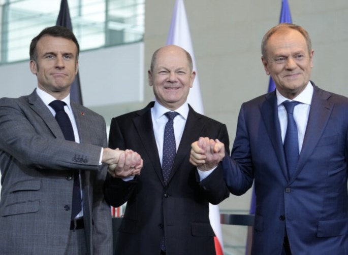 ην ενότητα και την αποφασιστικότητα των συμμάχων να συνεχίσουν να στηρίζουν στρατιωτικά, πολιτικά και οικονομικά την Ουκρανία ανέδειξαν οι ηγέτες των χωρών του «Τριγώνου της Βαϊμάρης», ο καγκελάριος Όλαφ Σολτς, ο πρόεδρος της Γαλλίας Εμανουέλ Μακρόν και ο πρωθυπουργός της Πολωνίας Ντόναλντ Τουσκ, κατά τις κοινές τους δηλώσεις μετά τη συνάντησή τους στην Καγκελαρία. Απέφυγαν ωστόσο ζητήματα στα οποία διαπιστώνεται διαφορά προσέγγισης, όπως σε σχέση με τους πυραύλους μεγάλου βεληνεκούς ή την παρουσία στρατιωτών του ΝΑΤΟ στην Ουκρανία.