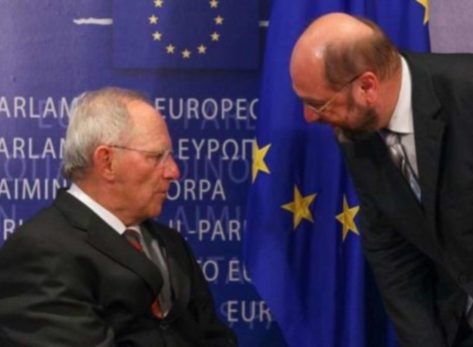 Στην επισήμανση του δημοσιογράφου ότι ο υποψήφιος σοσιαλδημοκράτης καγκελάριος έχει στο πλευρό του το ΔΝΤ ο κ. Βόλφγκανγκ Σόιμπλε απάντησε: «Όχι, ο κ. Σουλτς θέλει να επιβληθούν λιγότερες μεταρρυθμίσεις στην Ελλάδα, το ΔΝΤ όμως ζητά περισσότερες. Αλλά όταν προκύπτει η εντύπωση ότι υπογράφουμε μια συνθήκη, αλλά πρόκειται μόνο για ένα κομμάτι χαρτί, που σε περίπτωση ανάγκης δεν μπορούμε εφαρμόσουμε, τότε αυτό είναι η καλύτερη τροφή για τους ευρωσκεπτικιστές στη Γερμανία».