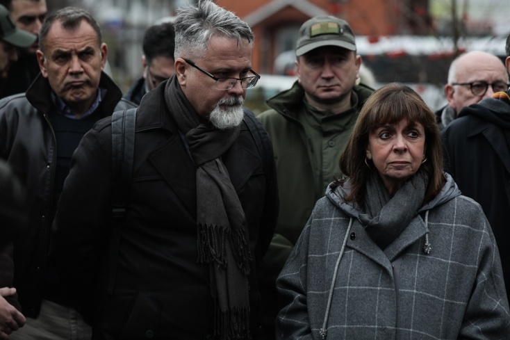 Στη Μπούτσα η κυρία Σακελλαροπούλου περιηγήθηκε στο σημείο που βρέθηκαν ομαδικοί τάφοι Ουκρανών πολιτών στον περίβολο της εκκλησίας του Αγίου Ανδρέα και είδε φωτογραφική έκθεση με αμάχους θύματα του πολέμου.