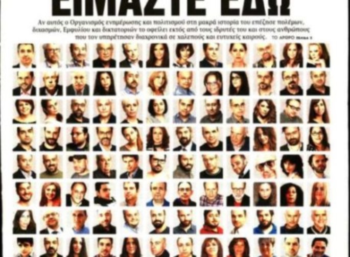 «Είμαστε εδώ» είναι ο τίτλος του ιστορικού πρωτοσέλιδου των ΝΕΩΝ στο οποίο πρωταγωνιστούν τα πρόσωπα των δημοσιογράφων και τεχνικών της εφημερίδας. Η λεζάντα αναφέρει με νόημα: «Αν αυτός ο Οργανισμός ενημέρωσης και πολιτισμού στη μακρά ιστορία του επέζησε πολέμων, διχασμών, Εμφυλίου και δικτατοριών το οφείλει εκτός από τους ιδρυτές του και στους ανθρώπους που τον υπηρέτησαν διαχρονικά σε χαλεπούς και ευτυχείς καιρούς»…