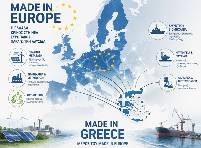 Η στροφή της Ευρώπης σε μια νέα, ενεργητική βιομηχανική πολιτική —με αιχμή τον πρόσφατο (Μάρτιος 2026) Κανονισμό για την Επιτάχυνση της Βιομηχανικής Δυναμικότητας1 και το δόγμα “Made in Europe”— σηματοδοτεί το τέλος μιας μακράς περιόδου αποβιομηχάνισης και εξάρτησης, θέτοντας ως στόχο την αύξηση της βιομηχανικής παραγωγής στο 20% της οικονομίας και επαναφέροντας την Ευρώπη ως μεγάλη παραγωγική δύναμη· εισάγει σαφείς όρους προέλευσης στις δημόσιες προμήθειες, απλοποιεί τις αδειοδότησης και κατευθύνει επενδύσεις σε τεχνολογία, πράσινη μετάβαση και άμυνα, οικοδομώντας ισχυρές ευρωπαϊκές αλυσίδες παραγωγής. Μέσα σε αυτό το νέο πλαίσιο, το “Made in Greece” παύει να είναι απλώς μια επιλογή αλλά μετατρέπεται σε μια στρατηγική αναγκαιότητα, προσφέροντας στην Ελλάδα μια ιστορική ευκαιρία να υπερβεί το εισαγωγο-εξαρτημένο μοντέλο και να ενταχθεί δυναμικά στη νέα ευρωπαϊκή παραγωγική αναγέννηση