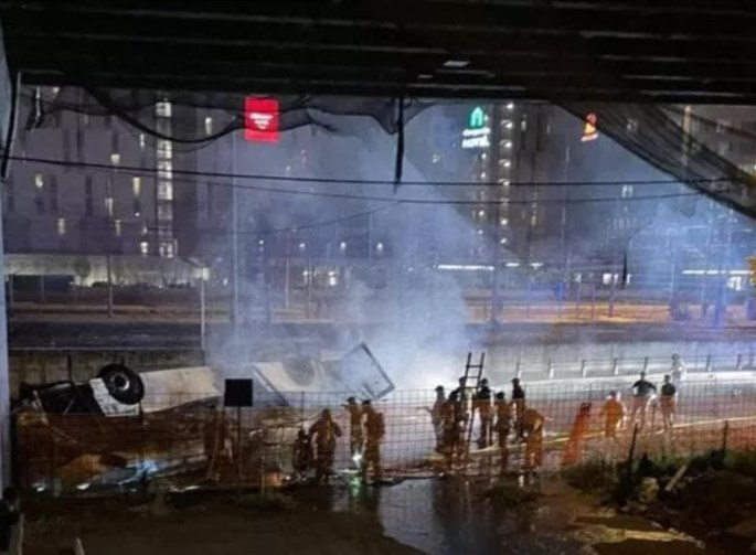 Ο οδηγός φέρεται να προσπάθησε να ελέγξει την κατάσταση, αλλά δεν μπόρεσε να αποφύγει την πτώση του λεωφορείου σε σιδηροτροχιά, η οποία βρίσκεται ακριβώς κάτω από την οδογέφυρα.
