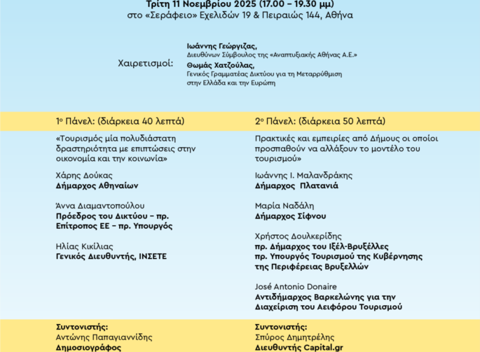 Η εκδήλωση θα πραγματοποιηθεί την Τρίτη, 11 Νοεμβρίου 2025, 17:00–19:30, στο Σεράφειο του Δήμου Αθηναίων (Εχελιδών 19 και Πειραιώς 144, Αθήνα).